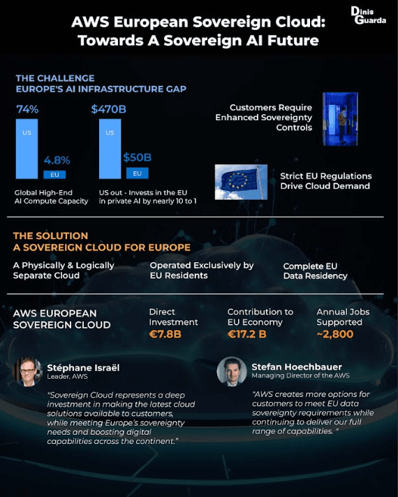 Europe currently owns only a small fraction of global AI compute capacity and hyperscale cloud infrastructure, while most of the capacity and investment is concentrated in the United States and China. At the same time, AI‑driven workloads are projected to more than double global data‑centre electricity consumption by 2030, raising concerns about energy security, water use and environmental sustainability. The new AWS European Sovereign Cloud, designed to operate independently within the European Union and led entirely by EU residents, offers an important opportunity to align these goals and enable an autonomous data and cloud AI economy for Europe
